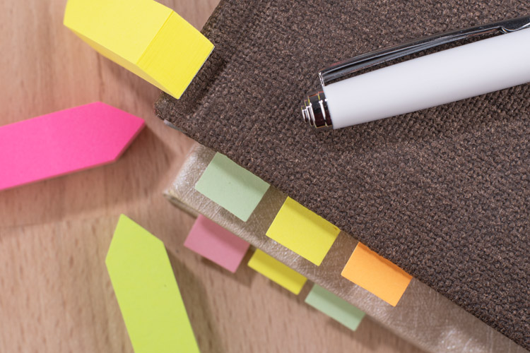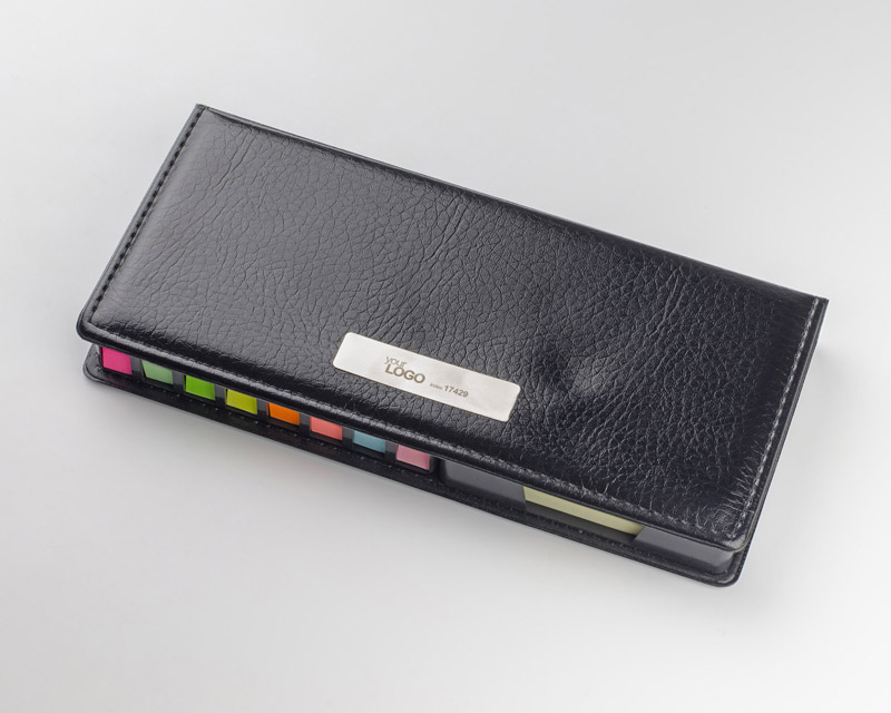 Zestaw karteczek samoprzylepnych pakowanych w czarne etui. Zestaw zawiera 1 bloczek dużych karteczek, 2 bloczki średnich karteczek i 8 małych bloczków zakładek indeksowych w różnych kolorach. Pudełko posiada miejsca na każdy z zestawów karteczek, dzięki czemu te się nie mieszają. W etui umieszczona jest kartka z miejscem na notatki. Logo grawerujemy na metalowej blaszce, którą można umieścić na wierzchu etui. Blaszka jest dołączona osobno.