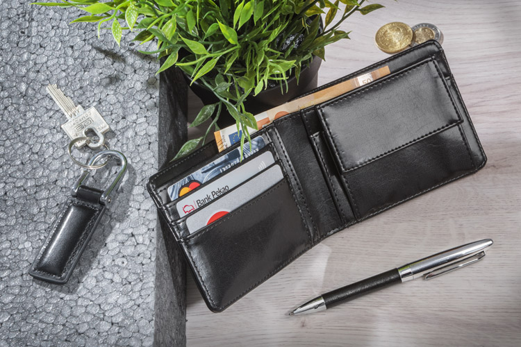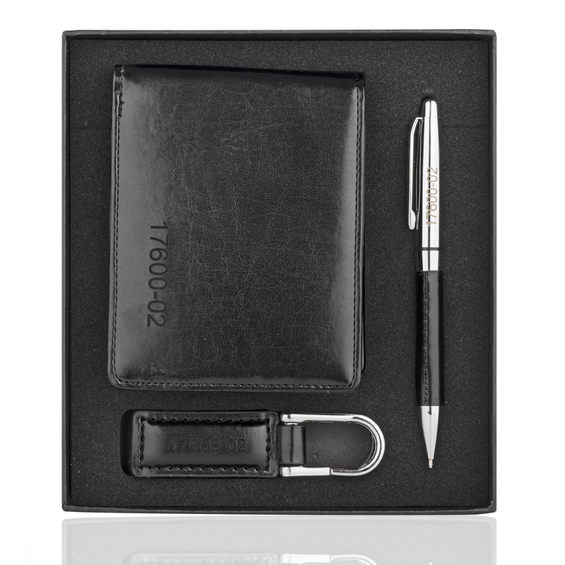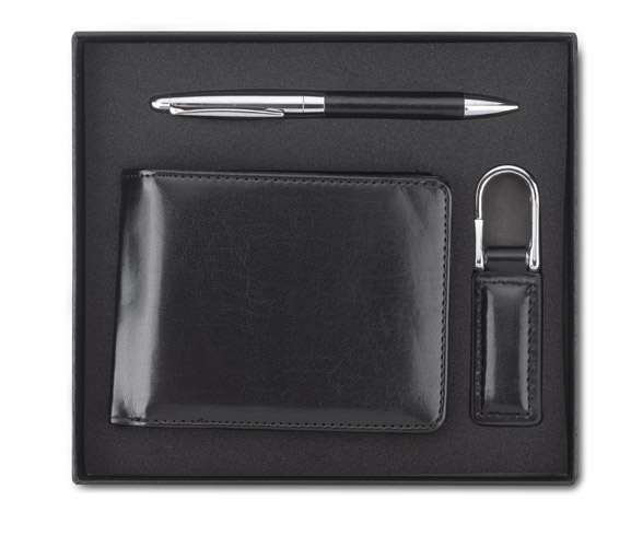 Komplet upominkowy zawierający portfel, brelok oraz metalowy długopis. Portfel wykonany z ekoskóry zawiera 2 przegródki na banknoty, kieszeń na bilon oraz dodatkowe kieszenie na karty kredytowe czy paragony. Całość zapakowana w eleganckie czarne pudełko. Grawerujemy na każdym elemencie lub na pudełku. Wymiary produktu 115 x 91 x 15 mm (portfel), 133 x ⌀10 mm (długopis), 65 x 25 x 5 mm (brelok), 181 x 163 x 31 mm (opakowanie)