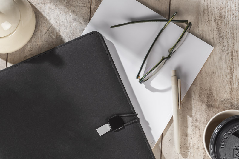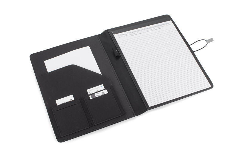 Teczka konferencyjna TELLA zamykana na gumkę zakończonąmateriałem skóropodobnym (PU) w kolorze szarym, która ułatwia otwieranie teczki i jednocześnie stanowi ciekawą i elegancka ozdobę . Zawiera jedną kieszeń do przechowywania dokumentów, dwie mniejsze kieszonki, miejsce na długopis i wizytówki oraz notes o formacie A4 z możliwością jego wymiany.