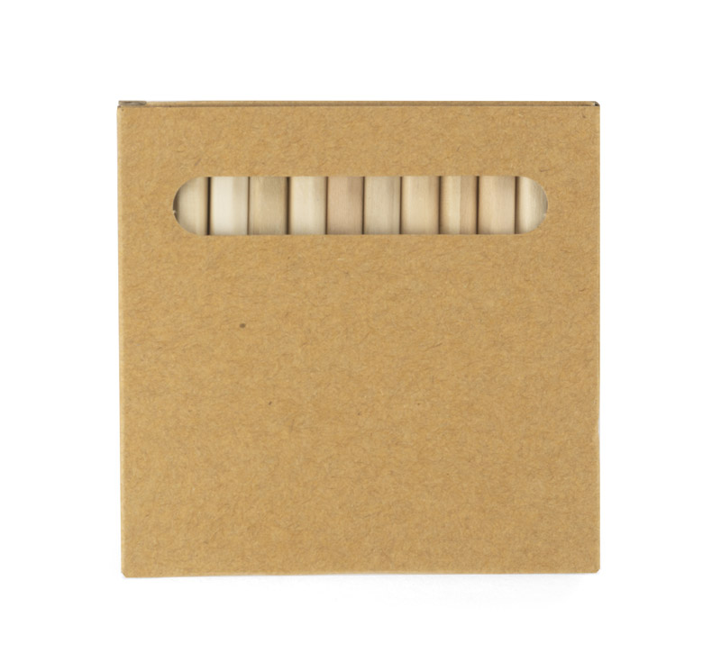 Drewniane kredki w dwunastu kolorach. Zapakowane w poręczny kartonik z okienkiem. Logo nadrukujemy na kartoniku.