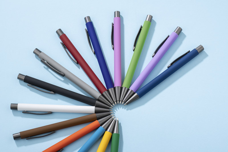 Długopis GOMA to prosty design połączony z przyjemną w dotyku gumowaną powierzchnią. Całość jest utrzymana w lekkich, matowych barwach. Wykonany z aluminium. Wykończenia w kolorze grafitowym. Wkład w kolorze czarnym.