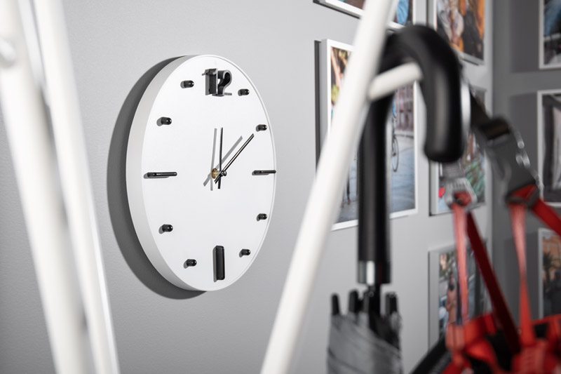 Duży zegar ścienny o nowoczesnym wyglądzie. Kontrast czarnych wskazówek na białej tarczy pozwala na bezproblemowe odczytanie godziny. Logo nadrukujemy na tarczy zegara. Baterie nie są dołączone - wymaga AA x 1 szt.