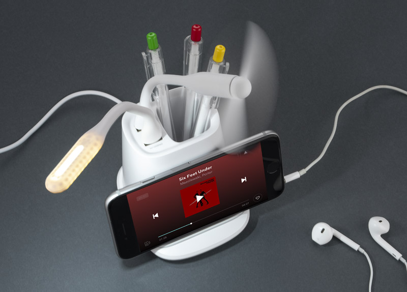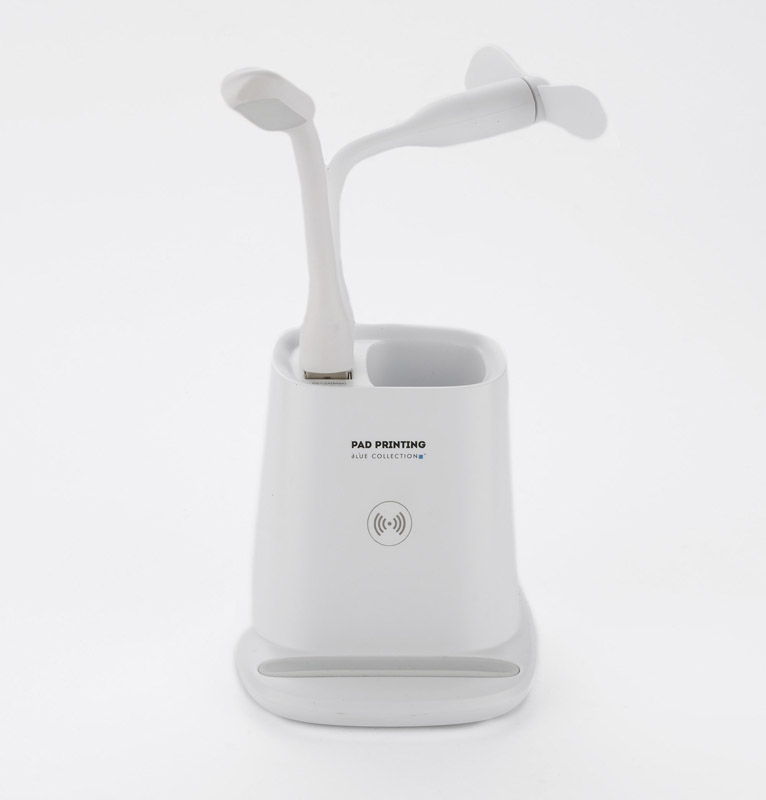 Przybornik na biurko BERGO to idealny gadżet do pracy przy biurku. Posiada on wbudowaną ładowarkę bezprzewodową, która służy również jako stojak do telefonu i dwa porty USB: USB-A który zasila dołączone do produktu akcesoria: wiatraczek i lampkę oraz USB-C, pozwalający łądować urządzenia elektroniczne. W przypadku niekorzystania z akcesoriów porty USB mogą funkcjonować jako hub. Dane techniczne: wejście USB-C: 5V/2A, wyjście ładowarki bezprzewodowej: 5W, 2 wyjścia USB: 5 V/2A (maks.)