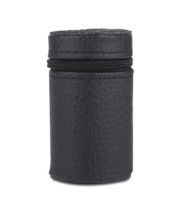 Cztery kieliszki stalowe o pojemności 30 ml pakowane w etui z materiału skóropodobnego (PU) PU zapinanego na zamek. Logo grawerujemy na powierzchni kieliszków.