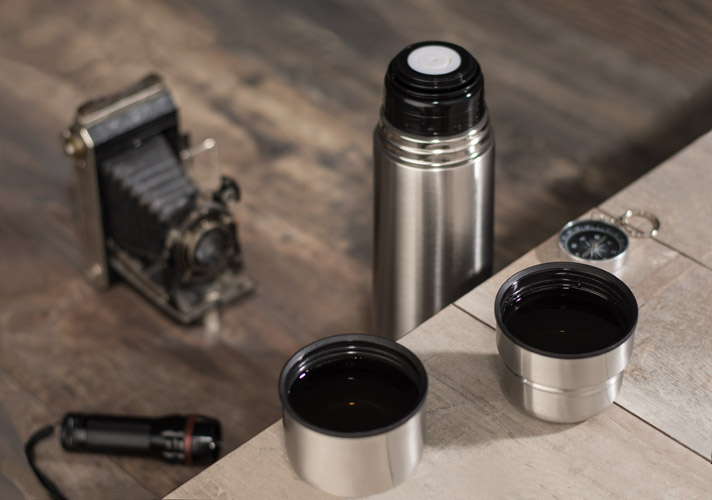 Duży termos z dwoma kubkami będzie idealny podczas jesienno- zimowych wycieczek. Oba kubki umieszczone są na górze termosu. Termos wykonany ze stali nierdzewnej, posiadający podwójne ścianki. Pojemność termosu 750 ml, nakrętki-kubeczka 100 ml. Logo wygrawerujemy.