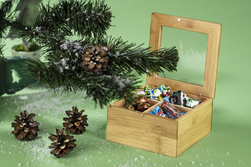 Gustowne pudełko na herbatę wykonane z bambusa. Pudełko podzielone jest na cztery części, dzięki czemu można przechowywać różne rodzaje herbaty.