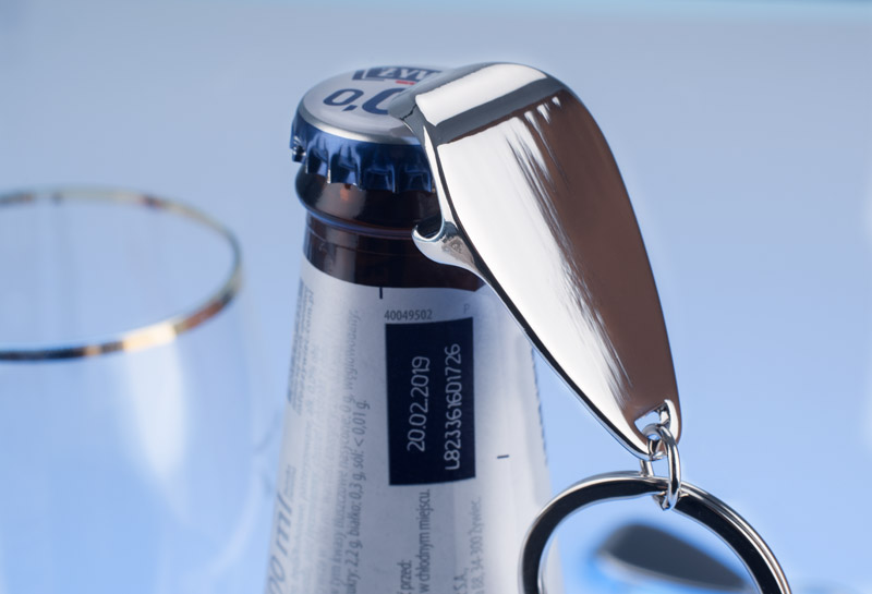 Brelok do kluczy w funkcją otwieracza, wykonany z chromowanego metalu.