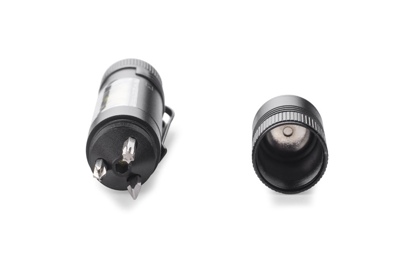 Latarka MAESTRO to gadżet wielofunkcyjny. Oprócz głównej funkcji, czyli lampki COB, w produkcie znajdziemy również zestaw trzech bitów: płaski, krzyżowy i gwiazdkowy. Latarka wyposażona jest w metalowy klip i magnes do mocowania.