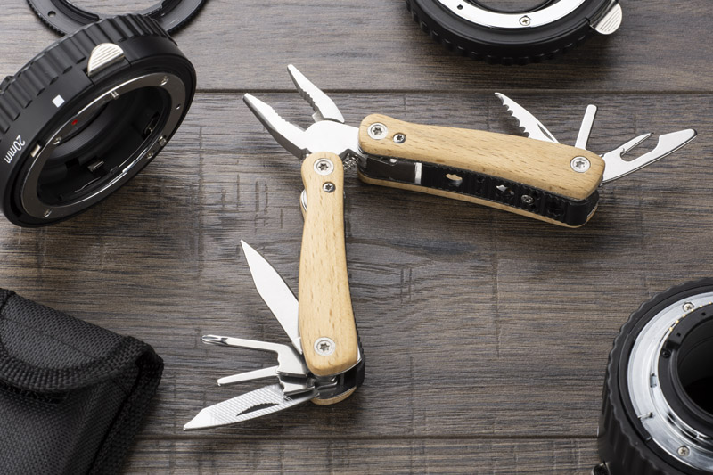 Narzędzie wielofunkcyjne FORT to gadżet w kieszonkowym rozmiarze, wykończony drewnem. Funkcje: kombinerki, przecinak, nóż, śrubokręt płaski i krzyżowy, pilnik, piła, otwieracz do butelek i puszek. W komplecie znajduje się również czarny, materiałowy pokrowiec na narzędzie.