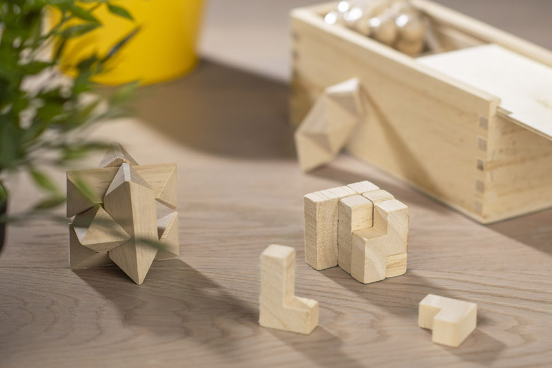 Zestaw ekologiczny trzech układanek logicznych. Zestaw pakowany w skrzyneczkę, wykonany z drewna.