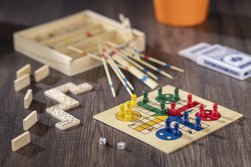 Zestaw gier w praktycznym drewnianym pudełku. Zawiera cztery różne gry: domino, bierki, grę planszową "Chińczyk" oraz talię kart. Logo wygrawerujemy na pokrywce pudełka.